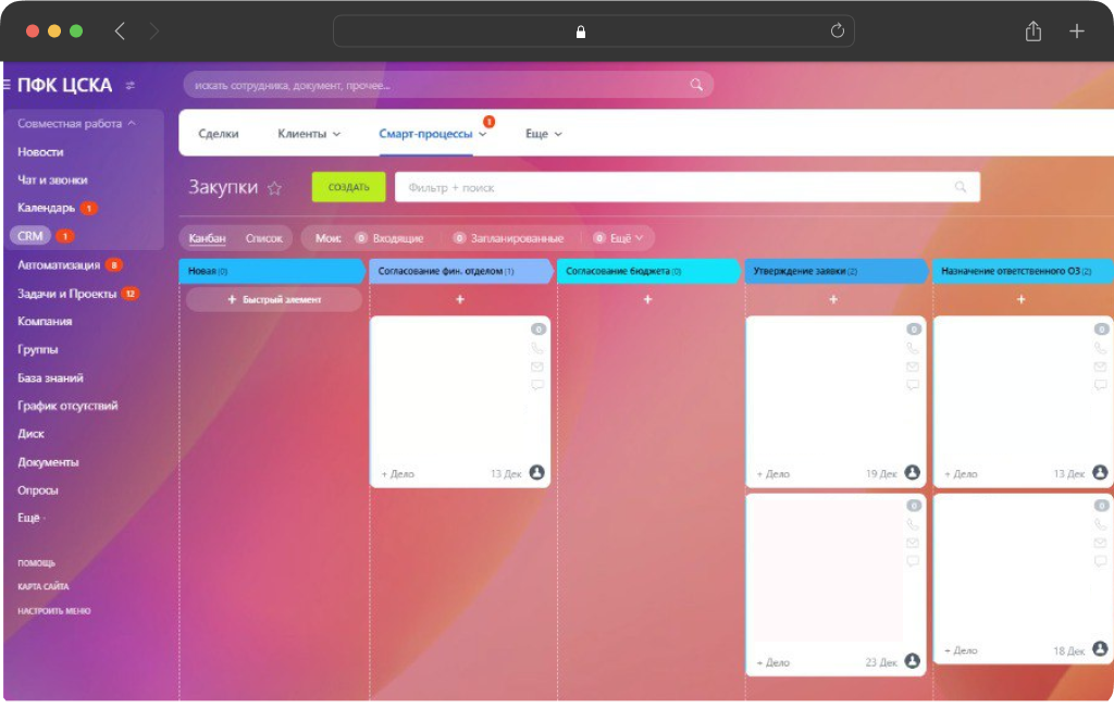 Клиенту требовалось оцифровать процесс закупок в компании и обеспечить сотрудникам доступ к полной информации по процессу закупок, который будет систематизирован и будет отображаться в CRM-системе.